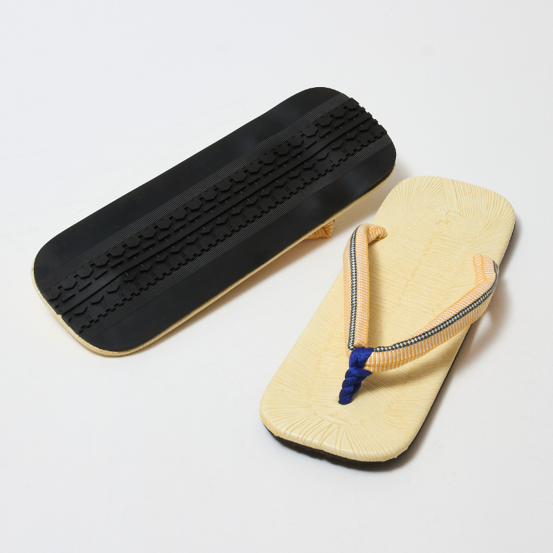 鼻緒に真田紐を用い、耐久性があり滑りにくいタイヤ底を使った雪駄です。