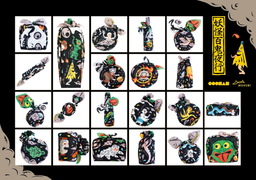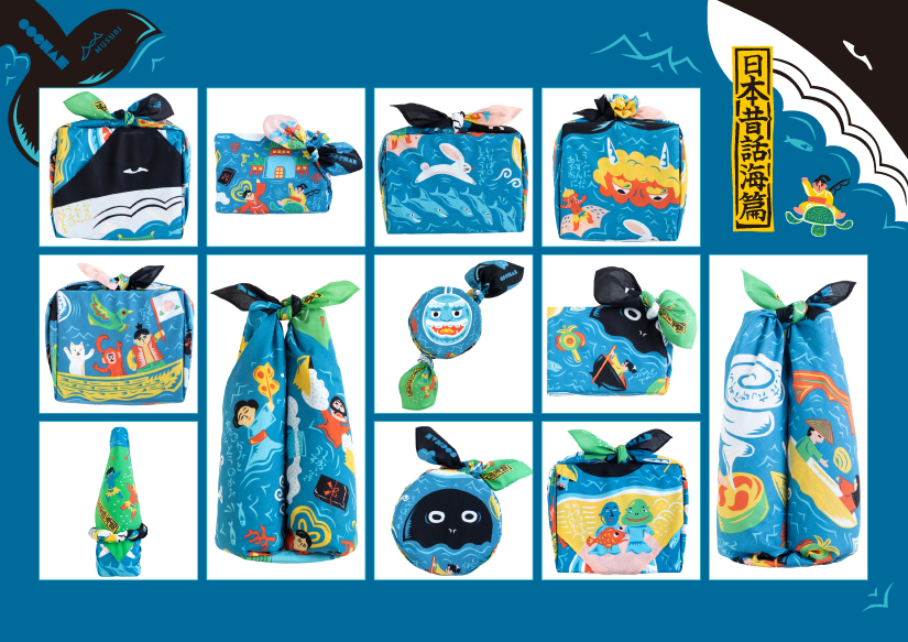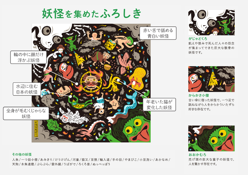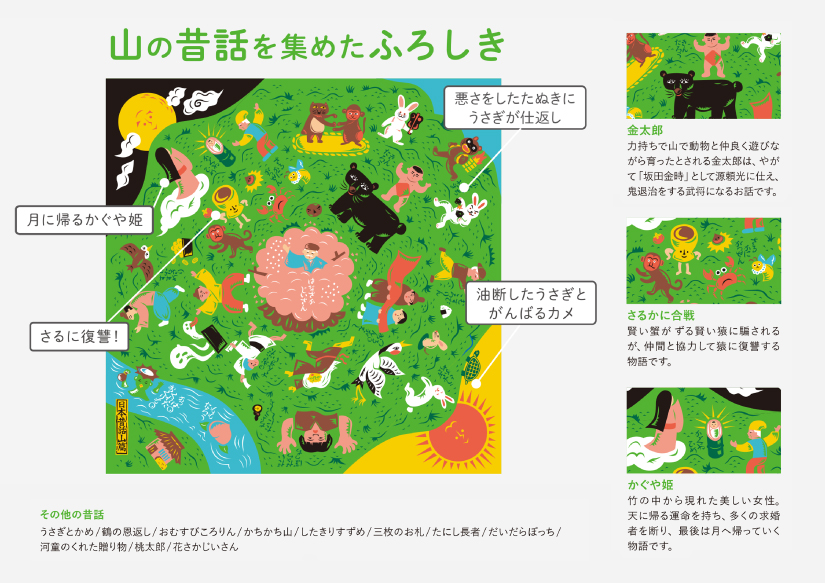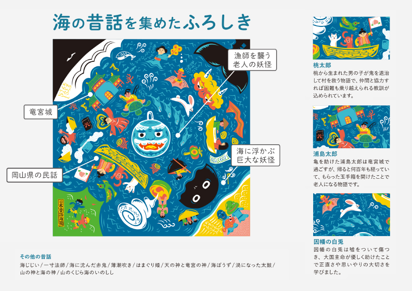 海・山・妖怪の物語のシーンを集めてふろしきにデザインしました。