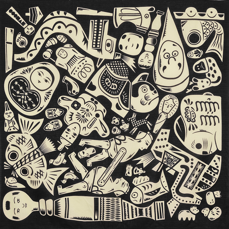 日本全国にある郷土玩具をモチーフにデザインしました。今では廃絶されてしまったものから、こけしのような伝統を守りながらつくられているもの等、中でも特にコチャエさんのお気に入りをふろしきにしました。